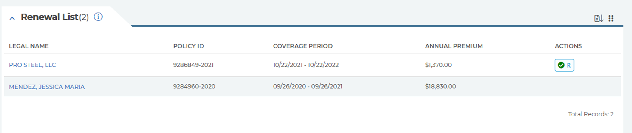 - Si hay renovaciones próximas para su número de acceso, verá una lista de renovación de todas las renovaciones pendientes. Las pólizas que son elegibles para renovación tendrán un ícono de marca de verificación verde con una "R" al lado de la categoría de acciones. Seleccione el ícono para abrir el proceso de renovación para esa póliza.